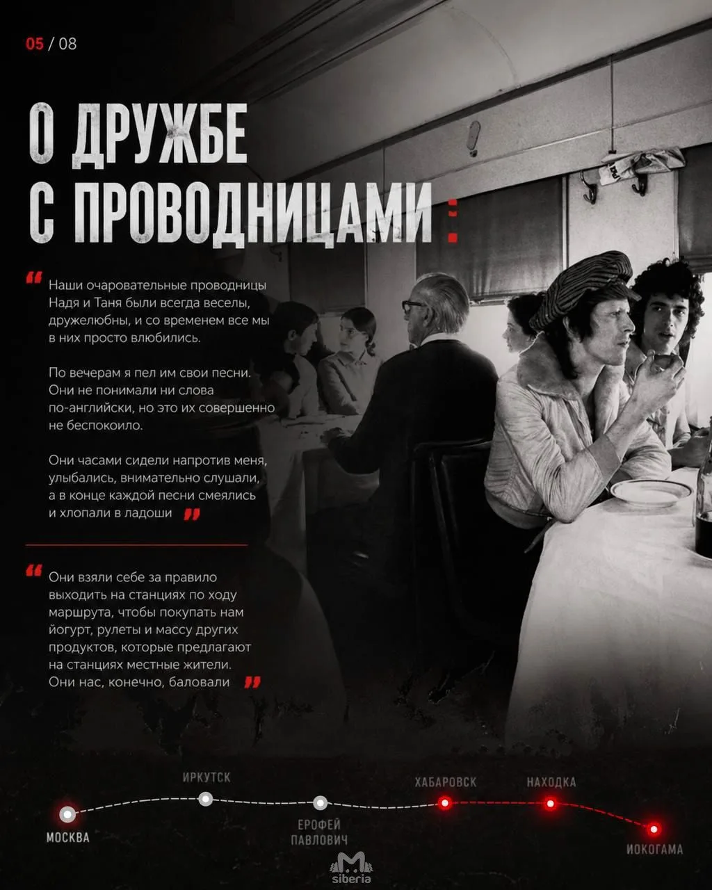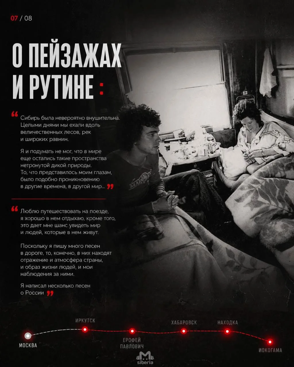 Из-за дикой аэрофобии в 1973 году легенда британского рока проехал почти по всему Транссибу, чтобы добраться из Токио в Лондон. Впечатления о его путешествии сквозь "железный занавес" по самой длинной железной дороге в мире сохранились в письмах и песнях, написанных в этой поездке.